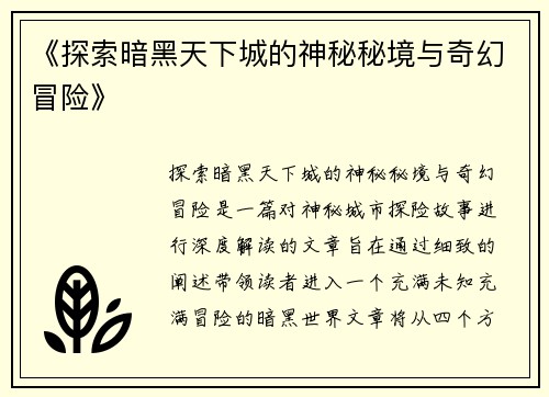 《探索暗黑天下城的神秘秘境与奇幻冒险》是一篇对神秘城市探险故事进行深度解读的文章,旨在通过细致的阐述,带领读者进入一个充满未知、充满冒险的暗黑世界。文章将从四个方面展开:一是“暗黑天下城的历史背景与设定”,探讨这座城市的起源、发展及其独特的历史风貌;二是“神秘秘境的探索与挑战”,剖析暗黑天下城中的各种神秘秘境,以及玩家在其中面临的挑战和谜题;三是“奇幻冒险中的角色与力量”,详细描述在这种奇幻冒险中出现的多样化角色与不同的技能系统;四是“暗黑天下城中的危险与宝藏”,深入分析城市中隐藏的危险,以及玩家如何在其中寻觅宝藏。最后,文章将综合各方面内容,展望未来冒险的无限可能性。